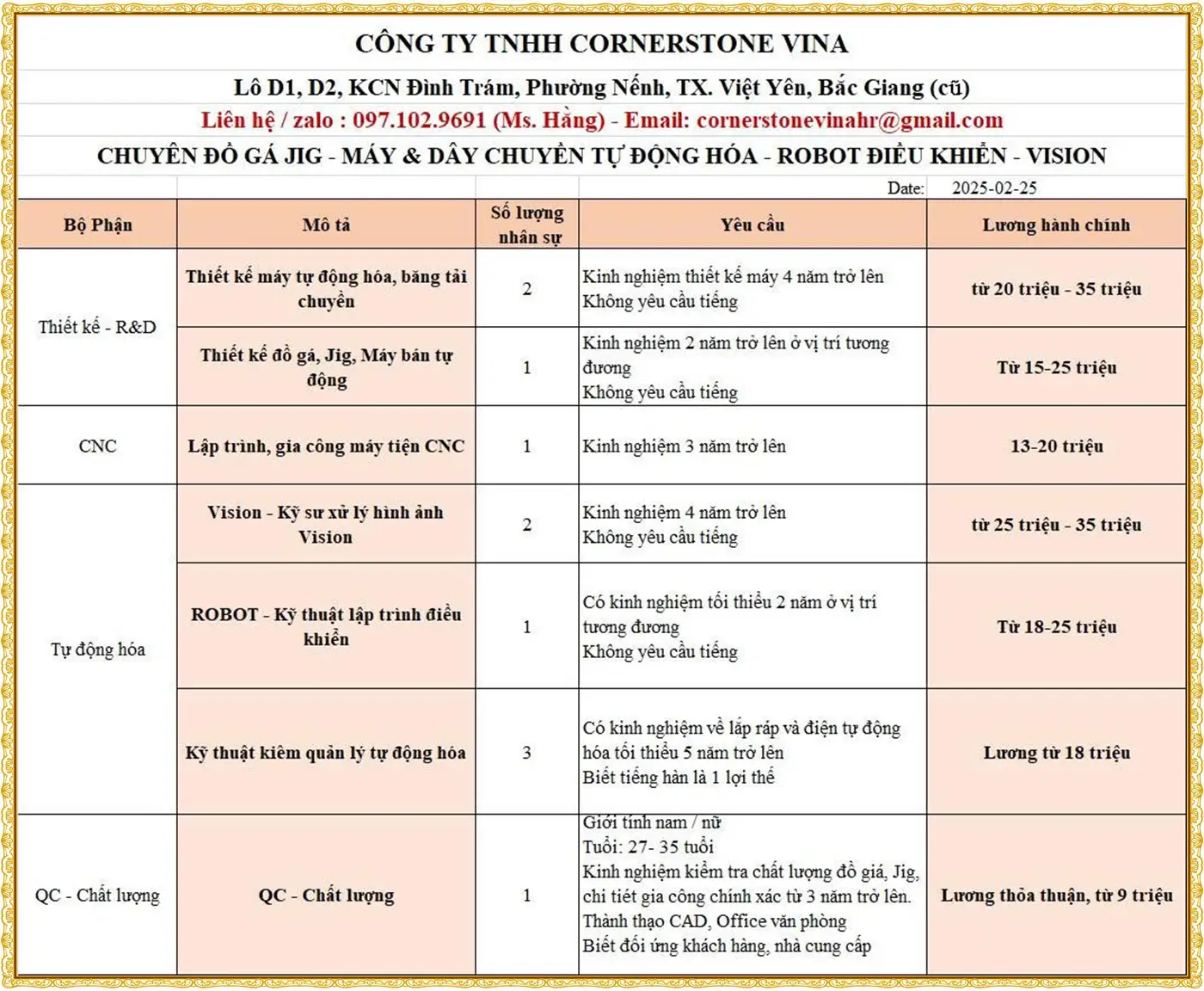 TuyendungBacninh.vn đăng tải việc làm tại Bắc Ninh cho người lao động phổ thông và kỹ thuật, với nhiều cơ hội trong lĩnh vực sản xuất, điện tử, cơ khí, may mặc, kho vận và lái xe. Nhu cầu tuyển dụng tập trung tại các khu công nghiệp VSIP Bắc Ninh, Yên Phong, Quế Võ, Tiên Sơn.